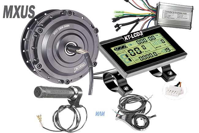 В комплект для электровелосипеда входит незаспицованный мотор MXUS XF07, мощность мотора - 350W, при 36V = 550Вт, при 48V = 750Вт, контроллер KT 36/48В 350Вт 14А, дисплей KT LCD-3 тип LCD дисплей панель управления, элемент управления на выбор ручка или курок газа, комплект устанавливается на переднее колесо. Аккумуляторная батарея для электровелосипеда заказывается отдельно согласно характеристикам комплекта и желаемой ёмкости А*ч.