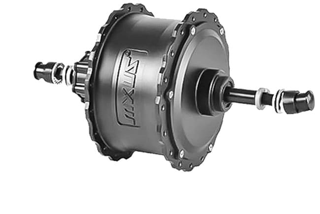 Мотор под трещотку устанавливается на зад и имеет расстояние между дропаутами 175/190мм. Он рассчитан на скорость 40-50км/час в зависимости от напряжения, диаметра обода и нагрузки. Имеется крепление под дисковый тормоз.
