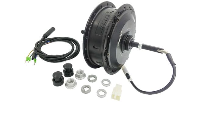 Мотор под трещотку устанавливается на зад и имеет расстояние между дропаутами 135мм. Он рассчитан на скорость 35-45км/час в зависимости от напряжения, диаметра обода и нагрузки. Имеется крепление под дисковый тормоз.