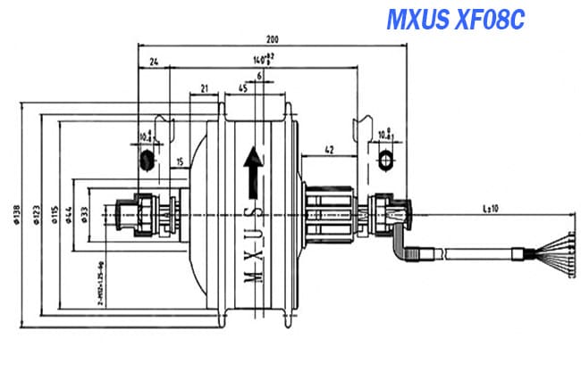 Мотор-колесо MXUS XF08C имеет встроенный понижающий планетарный редуктор с обгонной муфтой, за счет чего обладает хорошим крутящим моментом, а при движении накатом не создает сопротивления движению. Для управления мотором необходим контроллер для бесколлекторных двигателей на максимальную силу тока до 18А. Для подключения используется 3 фазных провода и 5 проводов от датчиков Холла (2 провода - питание, 3 - сигнальные).