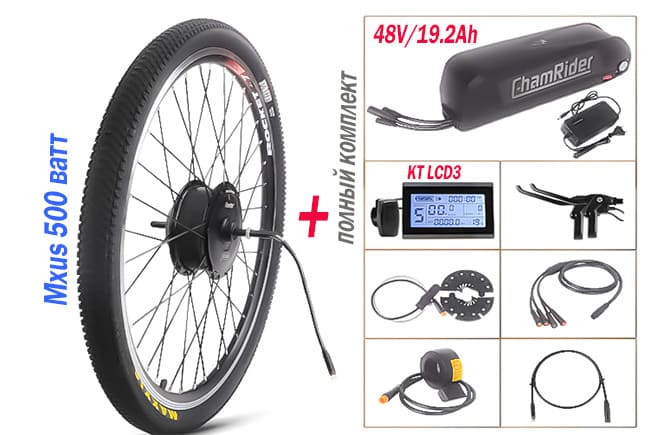 Комплект: мотор заспицованный в обод мотор MXUS XF \ 500W, установка по запросу - заднее колесо \ переднее, контроллер KT 48В 500Вт 20/22/25А, дисплей KT LCD-3 тип LCD дисплей , управление ручка газа или курок на выбор