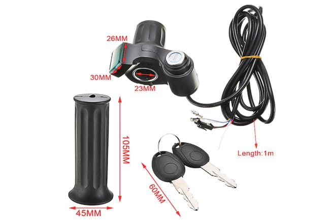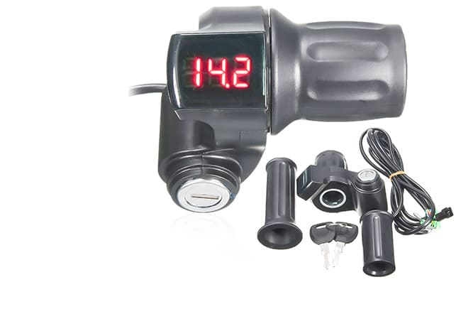 Половинчатая ручка газа с ключом и вольтметром для электровелосипеда, электросамоката, электромопеда, электроскутера. Подходит для стандартных контроллеров управления бесколлеторными моторами, мотор-колесами, коллекторными моторами. Взаимозаменяема с ручками газа в основе конструкции которых лежит датчик Холла.