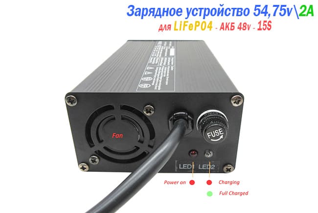 Зарядное устройство для LiFePO4, LFP . Это зарядное устройство имеет выходное напряжение 54,75 V с током заряда 2A подходит для сборок LiFePO4 - 15S. Стоимость: Зарядное устройство для АКБ LiFePo4 15S output 54,75V 2A на данный момент 2506 руб. Принцип заряда CC/CV