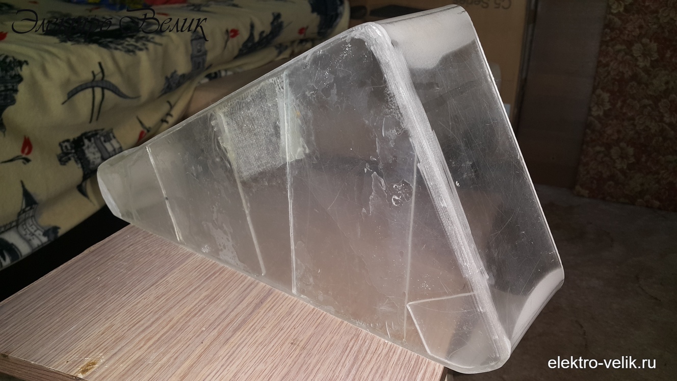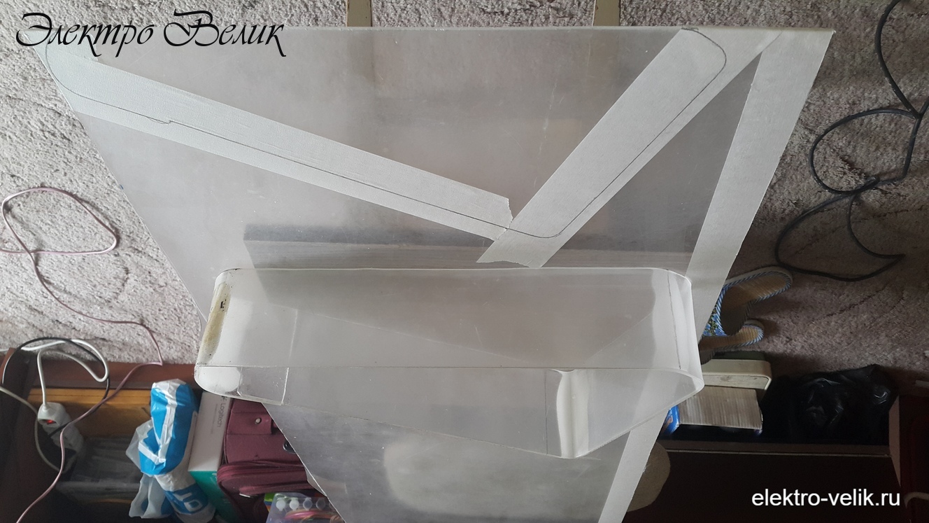 Далее я вырезал из оргстекла нижнюю стенку корпуса, вырезал так что бы она вошла внутрь треугольника корпуса, для прочности я нарезал две широкие полосы и склеил все клеем секунда с содой, а после застывания промазал слоем эпоксидной смолы, сначала планировал для большей прочности обклеить корпус изнутри стекловолокном, но потом отказался от этой идеи так как при нарезании разлетаются мелкие частицы стекловолокна и создают дискомфорт в виде зуда на коже.
