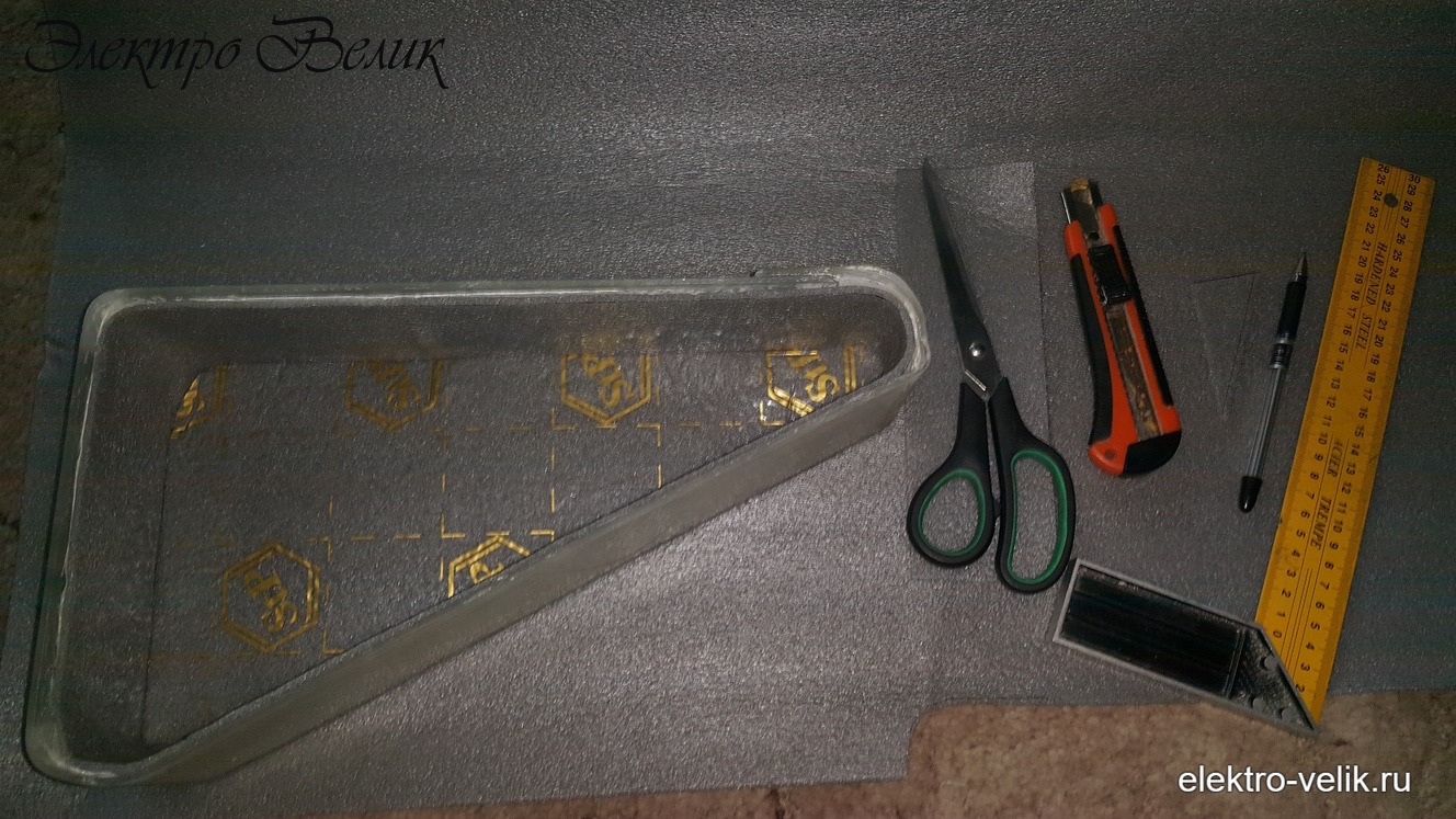 Корпус для аккумуляторной батареи электровелосипеда я решил сделать из оргстекла толщиной 4 мм. Раскроил лист согласно шаблону из картона. Сначала я отрезал полосу шириной 90 мм, так как длина аккумуляторов 18650 составляет 65мм плюс будут напаиваться силовые провода и должен остаться зазор с двух сторон для прокладки защитного эластичного слоя.