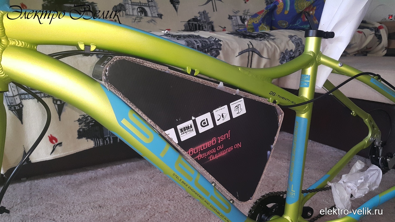 Аккумуляторная батарея крепится на раму в место держателя для воды через направляющую что позволяет быстро снимать и ставить аккумулятор. Стоимость корпуса на момент осень 2020 года 3422 рубля включая доставку но может меняться.