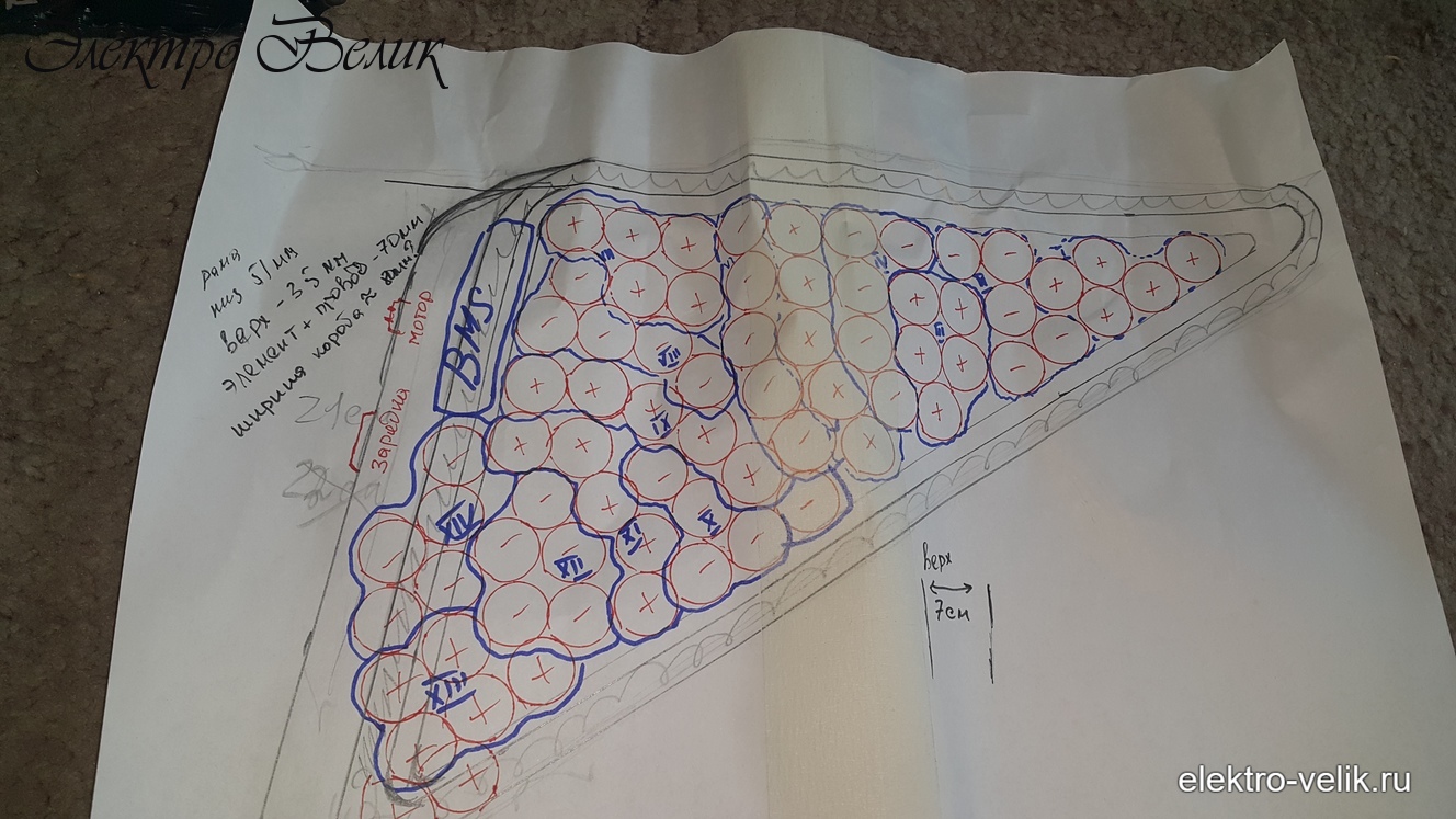Нарисовал примерную схему расположения аккумуляторов внутри будущего короба учитывая, что нужно оставить зазор для прокладки какого ни будь мягкого и упругого материала что бы не повредились аккумуляторы при тряске.