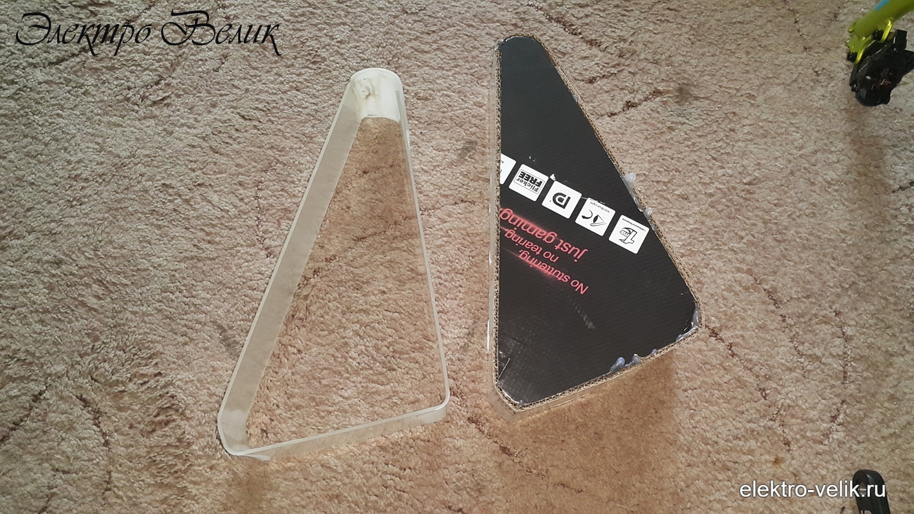Надоели мне громоздкие аккумуляторы на багажнике и в этот раз я решил собрать корпус аккумулятора для электровелосипеда и расположить его в раме, так как рама у меня не совсем треугольная и вымерить размеры будет сложно я решил сделать образец формы из плотного картона, он легко гнётся и можно сформировать форму учитывая все изгибы рамы.