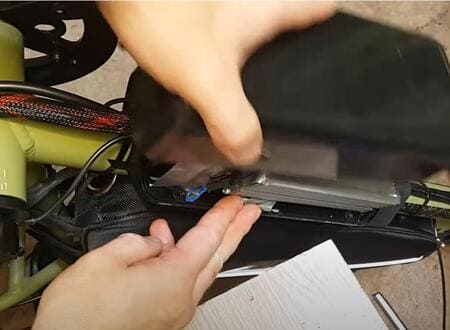 Установил аккумулятор на своё место… по низу рамы проложил провода, провёл их под коробом контроллера, теперь можно все подключить к контроллеру.