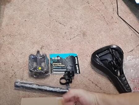 Посмотрим, что в коробке, вело сиденье, инструкция, пара педалей, подседельный штырь, механический звонок на руль, и непонятная шайба с болтом и винтом, так же в комплекте, велосипедный ключ, который мало что откручивает.