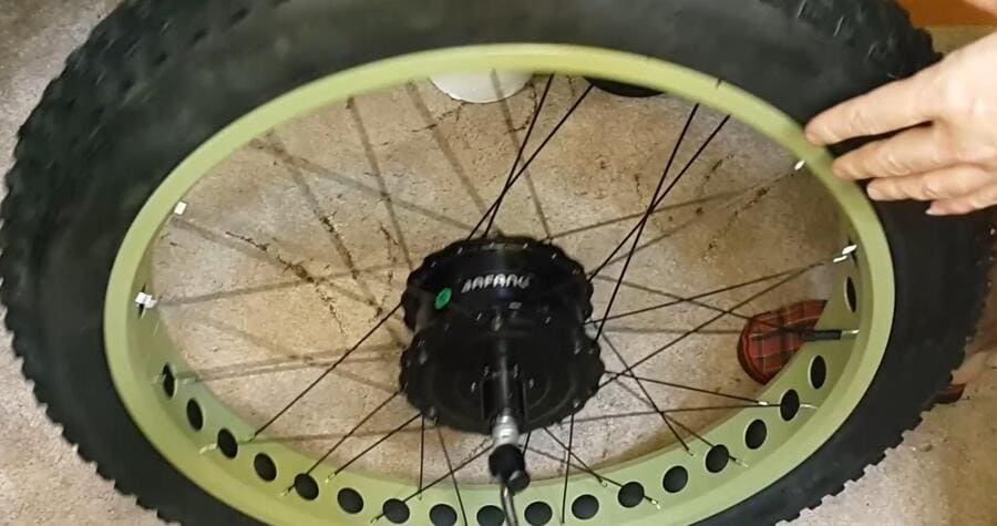 Теперь можно надеть защитную ободную ленту, накинуть покрышку так же следует учесть есть ли покрышке направленный протектор, вставить камеру, забуртовать, и накачать колесо. Все теперь уже мотор колесо готово к установке на раму велосипеда.