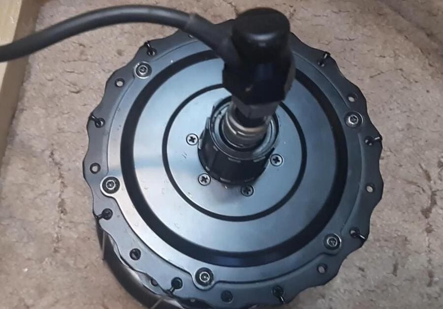 Итак, перейдём к спицовке мотора в обод фэтбайка, размер обода 26 дюймов. Для удобства я устанавливаю мотор на некоторую возвышенность так что бы спицы не цеплялись за пол и полностью висели в воздухе, для этого я использую пенопласт, который защищает мотор при транспортировке, в нем есть удобный вырез для провода, если высоты мало, добавляю, например, диск от гантелей.