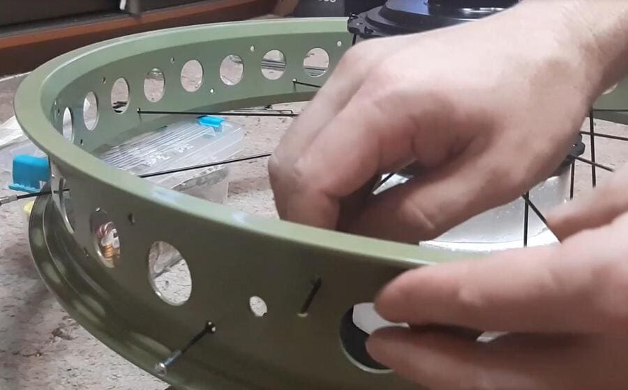 Все последующие спицы вставляем в обод через одно отверстие в ближней к вам кромке обода.