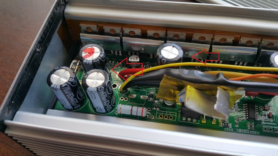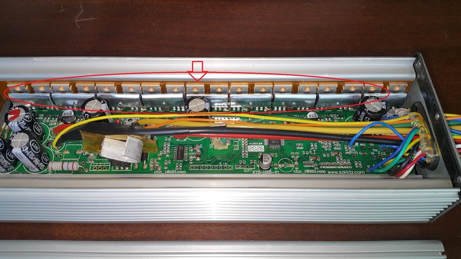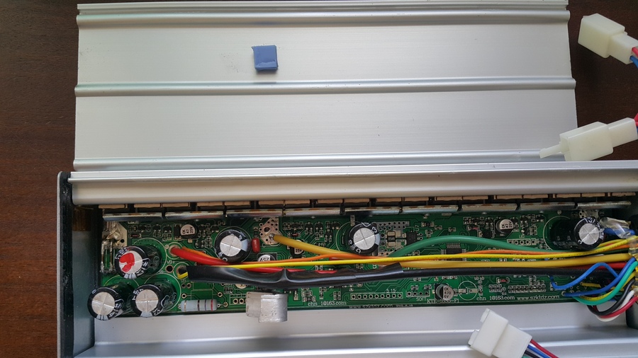 Здесь 18 мосфетов которые поджаты к корпусу для рассеивания нагрева, между корпусом и мосфетами наклеен термостойкий скотч, который предотвращает замыкание, мосфетов по шесть на каждый фазный провод мотора, чем больше мосфетов тем большую силу тока они могут пропустить.