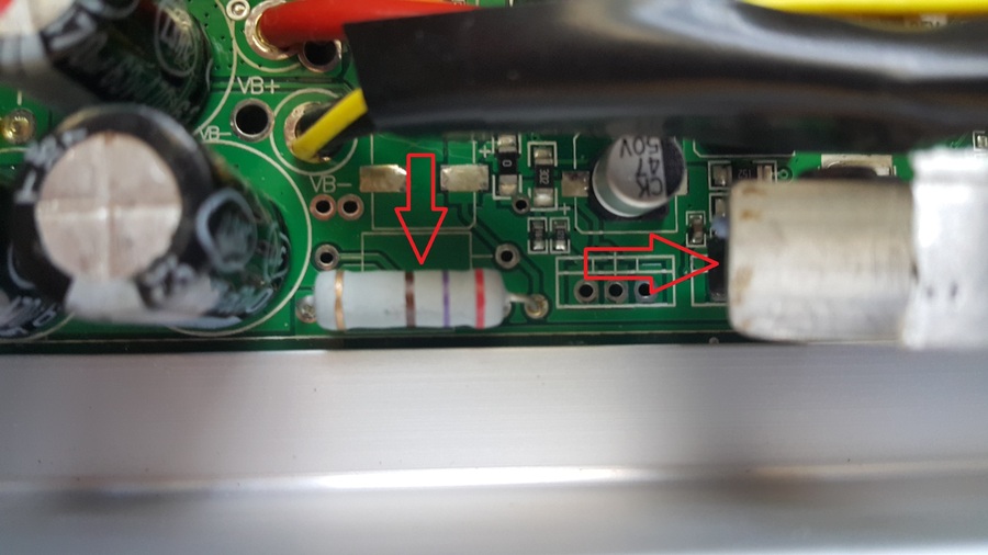 Вот здесь находятся аж два шунта, обычно один, залудив которые можно немного поднять мощность контроллера.