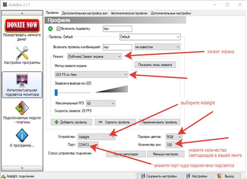 У меня уже установлена бесплатная программа Ambibox выставляем настройки как показано в инструкции, выбираем порт, в который подключили блок управления, и указываем количество светодиодов в ленте у меня 3 метра по 60 светодиодов на метр соответственно должно быть 180 поэтому я ставлю 180… программа перезагружается, и подсветка включается… отлично