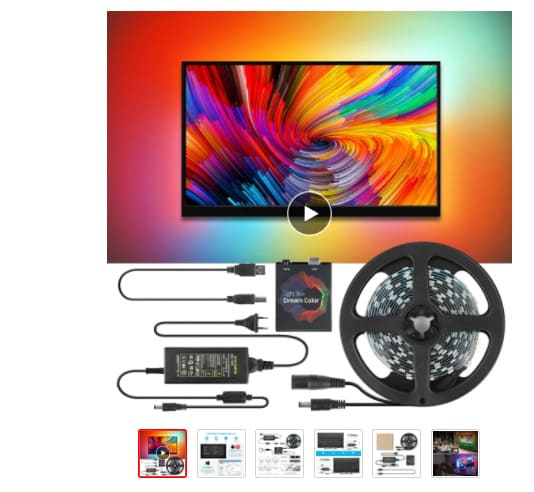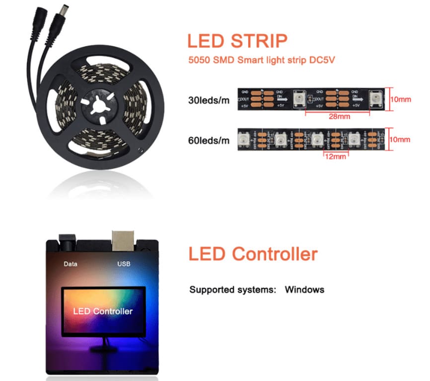 Цена за комплект как у меня лента 3 метра и 60 светодиодов на погонный метр. Универсальный комплект для подсветки монитора или телевизора. Данное решение только через подключение к ПК и управление программами Ambibox или Призматик. Просто устанавливается и настраивается. Для установки ленты нужно ее нарезать согласно размерам монитора или телевизора и спаять ленту согласно инструкции.
