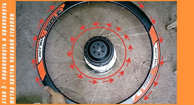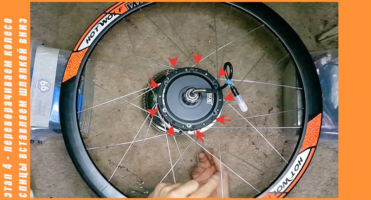 Этап третий - Переворачиваем колесо, и теперь нужно провернуть мотор в лево до упора всех продетых спиц в обод, так как у меня двойной обод, ниппеля спиц цепляются, нужно сделать так что бы они все прошли и были до упора в нижней кромке обода.