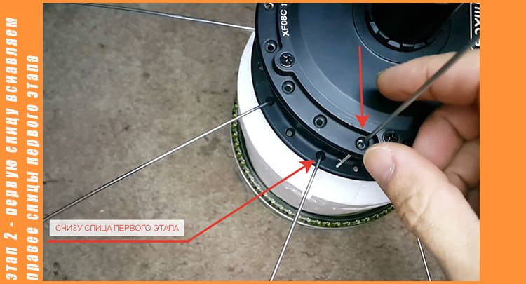 Этап четвёртый заключительный - Переворачиваем колесо, берём 9 спиц, также, как и в третьем этапе вставляем спицы снизу мотора, шляпкой вниз, сейчас в моторе осталось только 9 отверстий в них и продеваем оставшиеся 9 спиц, теперь берём любую спицу, наклоняем влево, и также, как и в третьем этапе над двумя проводим сверху, а под третью запускаем спицу и вставляем в отверстие в ободе, накручиваем ниппель на 2 – 3 оборота, все тоже самое проделываем с остальными.